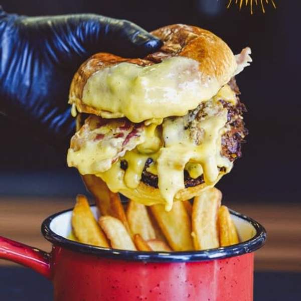 Doble smash burger (90 g.) cada una, doble cheddar curado, doble bacon, mermelada de bacon, disfrutala dipeando en nuestra salsa de queso cheddar