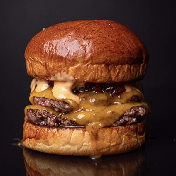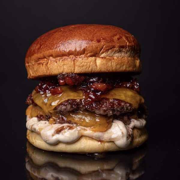 Doble disco de 90g de nuestro nuevo blend de vaca, queso cheddar americano, salsa mayo sour cream, cebolla frita y mermelada de bacon