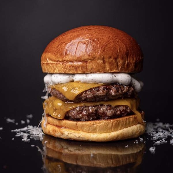 Doble disco de 90g de nuestro nuevo blend de vaca, queso cheddar americano, relish mix fresh , queso de oveja curado rayado y salsa mayo trufada. Incluye patatas fritas